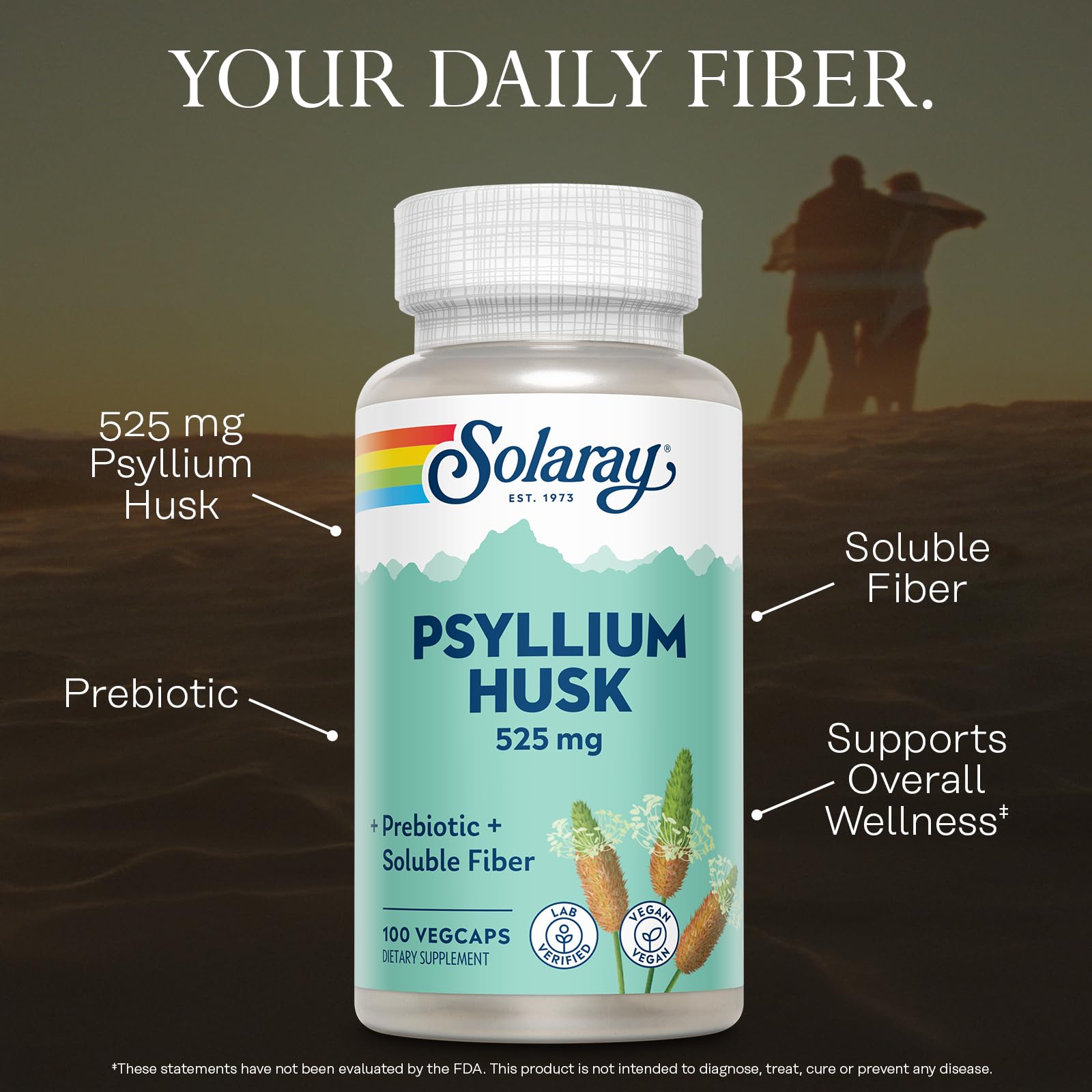 SOLARAY Psyllium Husk Capsules – 525 mg Prebiotic and Soluble Fiber Supplement for Overall Daily Wellness Support – Vegan, Lab Verified – 100 Servings, 100 VegCaps—