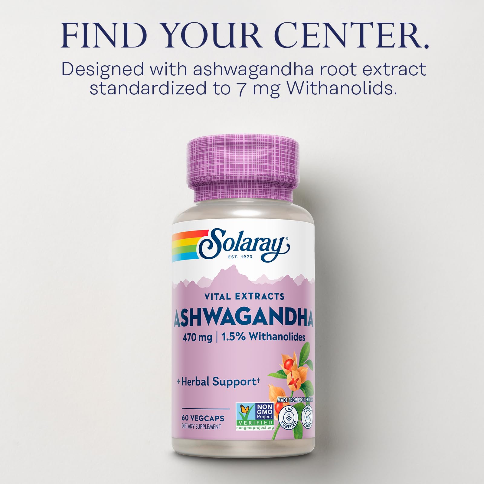 SOLARAY Vital Extracts Ashwagandha 470mg - Powerful Adaptogen - Ashwagandha Supplements w/ 7mg Withanolides, Wellness Support, Vegan, Non-GMO, Lab Verified, 60-Day Guarantee, 60 Servings, 60 VegCaps
